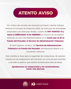 Por motivo del armado del escenario principal y demás trabajos relativos al Carnaval de Chetumal 2026, así como por las actividades preparadas para este gran festejo, a partir del 10 y hasta el miércoles 18 de febrero se cerrará a la circulación vehicular un carril del Boulevard Bahía, en el tramo que va de la Fuente del Pescador al Servicio de Administración Tributaria.