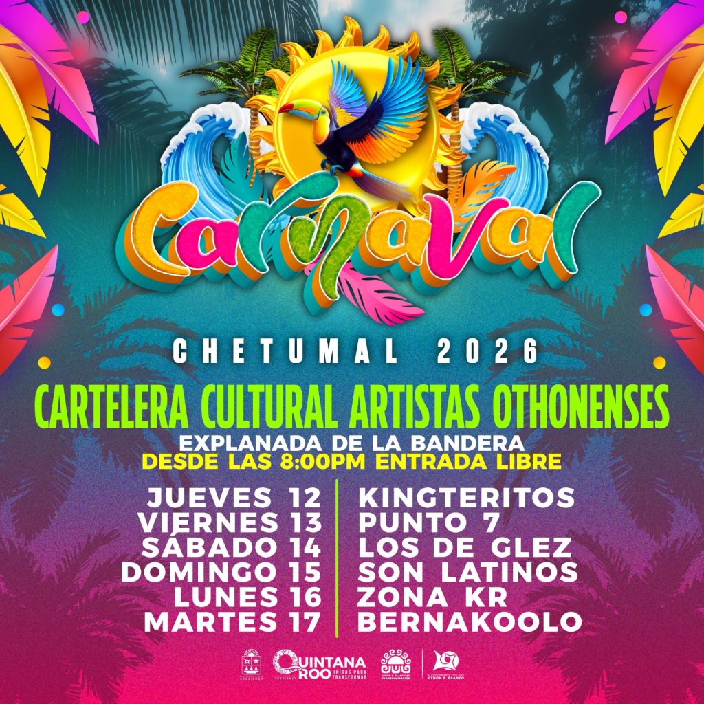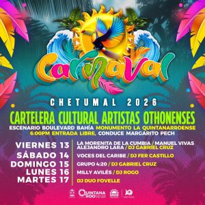 El talento local también brillará en el Carnaval, con la presentación de más de 25 artistas que estarán en los escenarios alternos de la Fuente del Pescador y en el Monumento a la Quintanarroense.