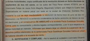 “Se dejó insubsistente la resolución de fecha del 13 de junio del 2019 y se revocó la sentencia condenatoria de fecha 28 de febrero del 2019. En consecuencia, se absolvió a la imputada Paula González Cetina, para su conocimiento y efectos legales correspondientes, y por lo que respecta a la última autoridad en mención, infórmese de que deberá dejar sin efectos la suspensión de los derechos político-electorales de la sentenciada Paula González Cetina, en virtud de haberse absuelto a la acusada de mérito”, refiere el pronunciamiento legal.