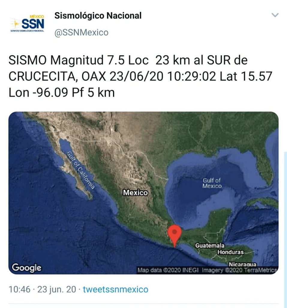 al interior El País lo del mundo Principales #ACTUALIZACIÓN Reportan que fue de 7.5 grados el sismo Publicado el 23 junio, 2020 at 10:52 am by Augusto O 2037 0 SISMO Magnitud 7.5 Loc 23 km al SUR de CRUCECITA, OAX 23/06/20 10:29:02 Lat 15.57 Lon -96.09 Pf 5 km