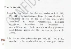 ‘Uno. Acordar con las dirigencias nacionales de PAN, PRI, MC, PRD y organizaciones afines la postulación de candidatos únicos en los distritos electorales federales de mayor rentabilidad.