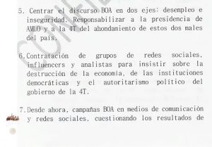 ‘Cinco. Centrar el discurso del bloque opositor en dos ejes: desempleo o inseguridad, responsabilizar a la Presidencia de AMLO y de la 4T del ahondamiento de estos dos males del país.