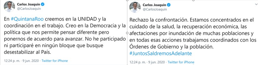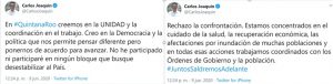 Con estos dos textos publicados en su cuenta de Twitter, Carlos Joaquín dejó como concluido el tema sin intenciones de polemizar y generar más controversia al respecto, lo cual es considerado por los políticos quintanarroenses como un “Yo estoy en mi chamba y no es mi estilo”.