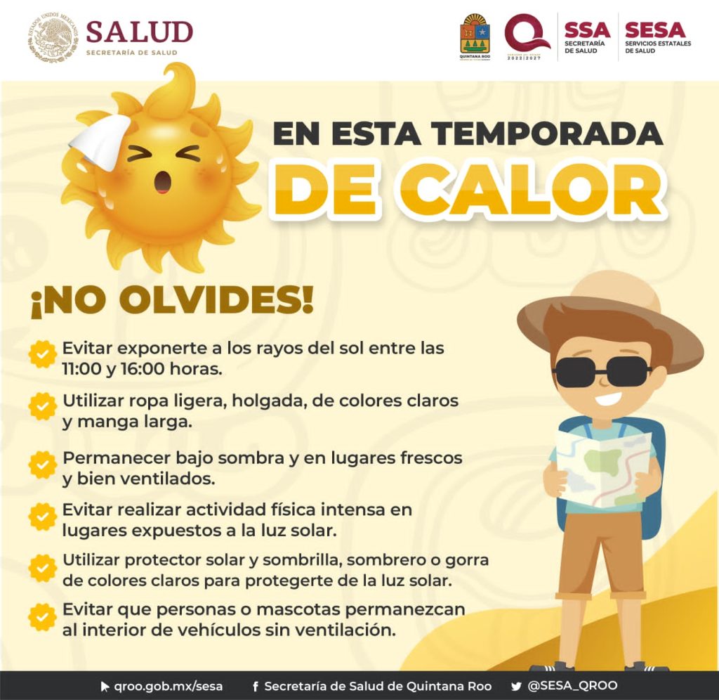 A la fecha el estado de Quintana Roo registra 23 casos de personas con padecimientos relacionados con altas temperaturas, por golpe de calor hay 10 casos, mientras que por quemadura solar se registran 13.