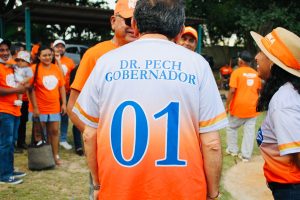 Posteriormente el Dr. Pech saludó a las personas que acudieron este domingo al balneario El Palmar, lo cual realizó en compañía de la candidata a diputada por el Distrito XIV de MC, Erika Cornelio, con quién más tarde acudió al campo de béisbol Primero de Septiembre, dónde dio el batazo inicial del juego entre la novena de los Barrileros y el equipo Dr. Pech.