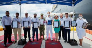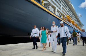 La edil cozumeleña junto con diversas autoridades, recibió a la embarcación comandada por el capitán Jason Preston, misma que pertenece a la compañía Disney Cruise Line, y que arribó este jueves a las 7:00 de la mañana proveniente de Miami, Florida, y zarpó a las 5:00 de la tarde rumbo al cayo exclusivo de la empresa, Castaway Cay para luego regresar al puerto de inicio.