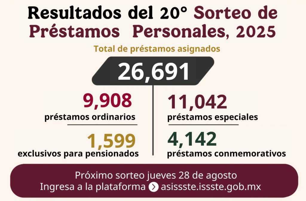 CIUDAD DE MÉXICO, 20 de agosto. – El Instituto de Seguridad y Servicios Sociales de los Trabajadores del Estado (ISSSTE), informa que en el vigésimo sorteo convencional del Programa Anual de Préstamos Personales 2025 se asignaron 26 mil 691 créditos, es decir, salieron todos aquellos que cumplieron los requisitos.