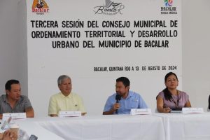 BACALAR, 14 de agosto. – En la Tercera Sesión del Consejo Municipal de Ordenamiento Territorial y Desarrollo Urbano del municipio de Bacalar, se destacó la unidad y el trabajo en equipo para contar con un crecimiento ordenado, sostenible y sustentable, ante todo detonar el potencial de desarrollo económico y turístico que se presentará con el Tren Maya y otras importantes obras federales, estatales y municipales.
