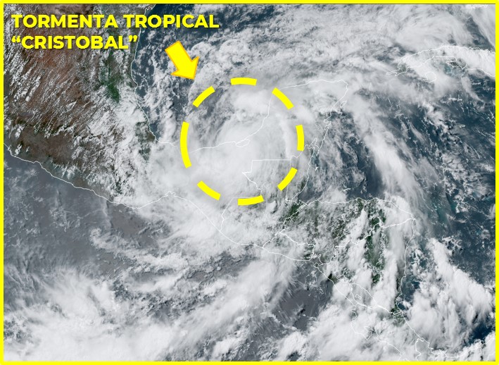El centro de la tormenta tropical “Cristobal”, se ubica en tierra sobre el estado de Campeche, aproximadamente a 35 km al sur de Ciudad del Carmen, Camp. Se prevé que su debilitamiento sea gradual y se desplace hacia el norte, tendiendo a salir nuevamente a aguas del Golfo de México sobre la costa de Campeche. Produce lluvias torrenciales a puntuales extraordinarias en el sureste del país y la Península de Yucatán.