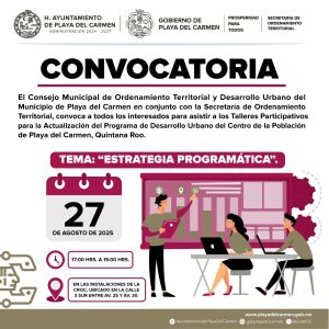 PLAYA DEL CARMEN, 5 de agosto. – Con la participación activa de autoridades, colegios, cámaras empresariales y ciudadanía organizada, el gobierno municipal de Playa del Carmen, encabezado por la presidenta Estefanía Mercado, avanza con paso firme en la actualización del Programa de Desarrollo Urbano (PDU).