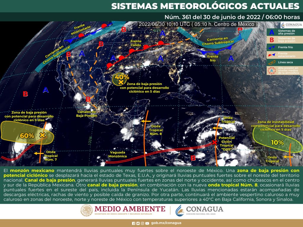 Este día, el monzón mexicano mantendrá lluvias puntuales muy fuertes sobre el noroeste de México. Asimismo, una zona de baja presión con potencial ciclónico se desplazará hacia el estado de Texas, E.U.A., su circulación y la humedad del Golfo de México, originarán lluvias puntuales fuertes sobre el noreste del territorio nacional. Canal de baja presión sobre el interior del país, asociado con la entrada de humedad de ambos océanos, generarán lluvias puntuales fuertes en zonas del norte y occidente, así como chubascos en el centro y sur de la República Mexicana. Otro canal de baja presión, en el sureste de México, en combinación con la entrada de humedad generada por la nueva onda tropical Núm. 8, sobre el Mar Caribe, ocasionará lluvias puntuales fuertes en el sureste del país, incluida la Península de Yucatán. Las lluvias mencionadas estarán acompañadas de descargas eléctricas, rachas de viento y posible caída de granizo. Por otra parte, continuará el ambiente vespertino caluroso a muy caluroso sobre entidades del noroeste, norte y noreste de México con temperaturas superiores a 40°C en Baja California, Sonora y Sinaloa.