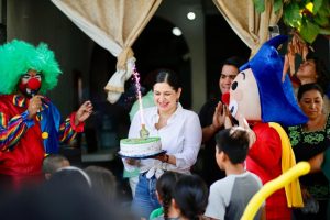 Estefanía Mercado entregó juguetes, rompió piñatas y cortó pasteles por su cumpleaños en la amena convivencia con los menores de edad; la jornada del Día de la Niña y el Niño concluyó por la noche en Puerto Aventuras, rodeada de sonrisas y parabienes de las familias solidarenses.