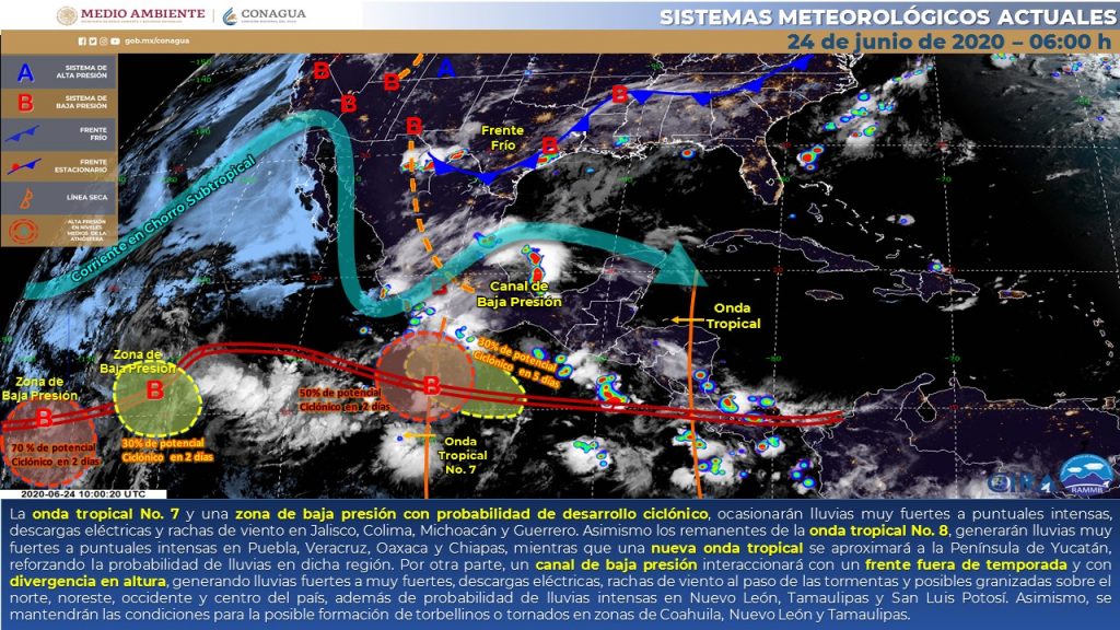 Este día la onda tropical No. 7 y una zona de baja presión con probabilidad de desarrollo ciclónico al sur de las costas de Guerrero y Michoacán, ocasionarán lluvias muy fuertes a puntuales intensas, descargas eléctricas y rachas de viento al paso de las tormentas en Jalisco, Colima, Michoacán y Guerrero.