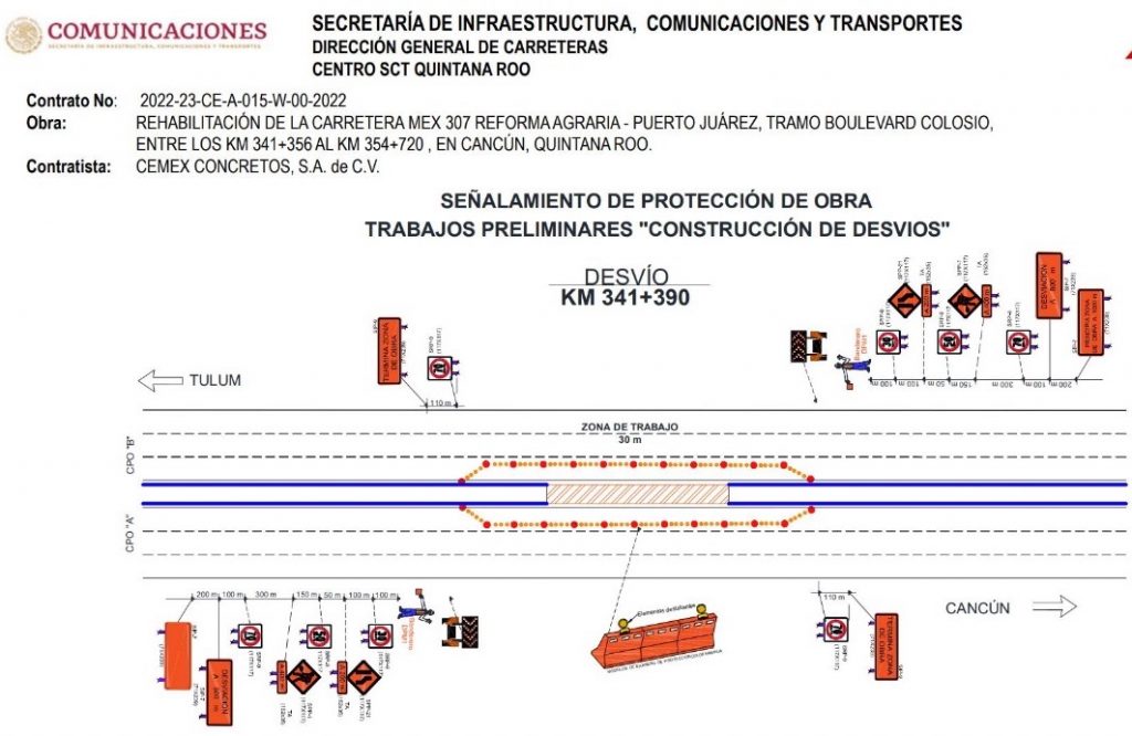 Es por ello que se tendrá confinamiento del carril de alta velocidad, en ambos lados del camino, con horario de 11:00 a 16:00 horas. De esta forma quedan en funcionamiento dos carriles de circulación por cada sentido del tráfico. El primer desvío se localiza en el Km 341+390, a la altura de plaza Luxury.