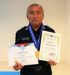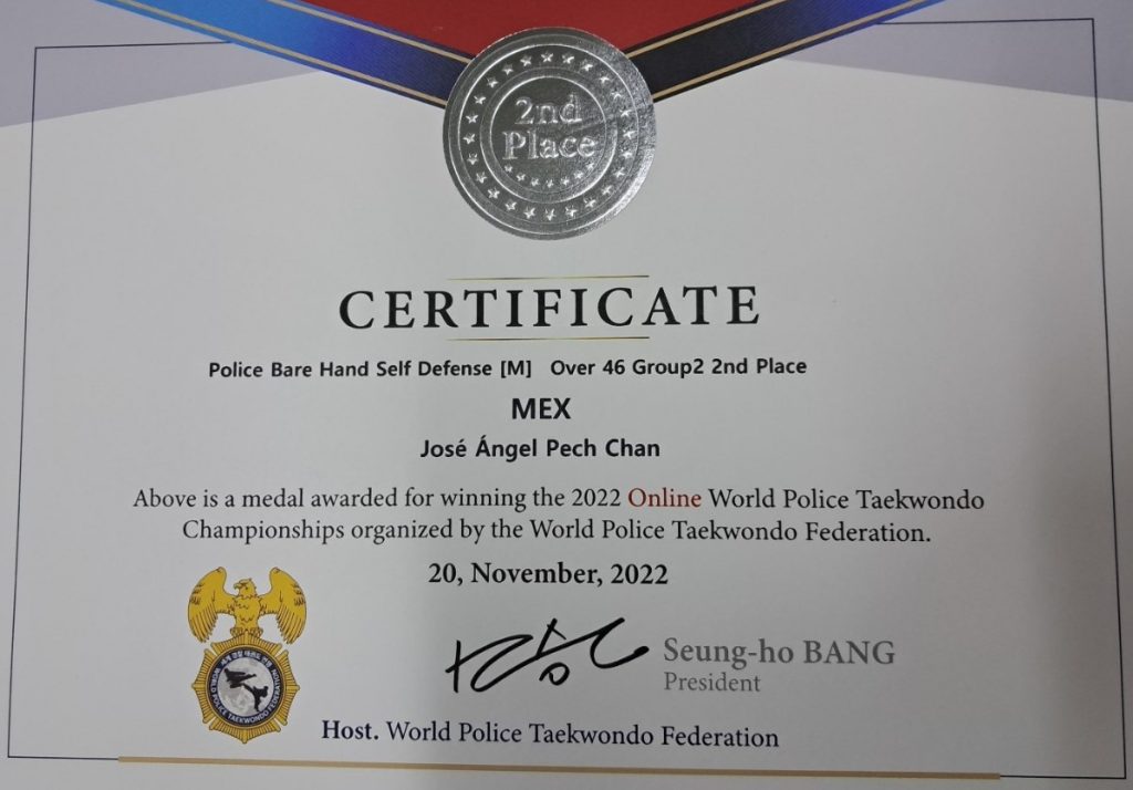 CHETUMAL, 29 de marzo.- El taekwondoista Cinta Negra, 5to DAN, José Ángel Pech Chan, originario de Lepán, Yucatán, pero avecindado desde hace muchos años en Chetumal, obtuvo el certificado y medalla del segundo lugar en el Campeonato Mundial de Defensa Personal en Línea, evento organizado del 13 al 20 de noviembre de 2022, por la Federación Mundial de Tae Kwon Do Policial, con sede en Seúl, Corea.
