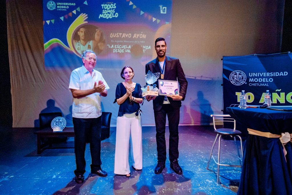 En el marco de los festejos por el décimo aniversario de la Universidad Modelo el plantel ha organizado diversas actividades deportivas, académicas y culturales por lo que este jueves en el Teatro Constituyentes el nayarita ex jugador de baloncesto ofreció la conferencia “La escuela de la vida desde una duela” en la que descubrió detalles de su vida y experiencial personal al participar con grandes estrellas del basquetbol en las principales competencias nacionales e internacionales incluyendo su paso por el selectivo nacional mexicano.