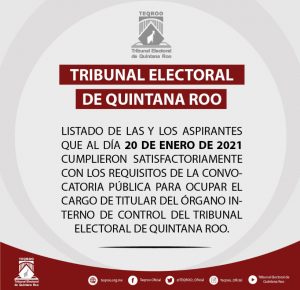 Chetumal, Q.R. – El Pleno del Tribunal Electoral de Quintana Roo informó que se inscribieron 25 aspirantes al cargo de Titular del Órgano Interno de Control, dentro del plazo establecido del 11 al 15 de enero, de los cuales 14 cumplieron con los requisitos establecidos en la Convocatoria Pública emitida el 7 de enero de 2021 y 11 están en proceso de subsanar documentación.