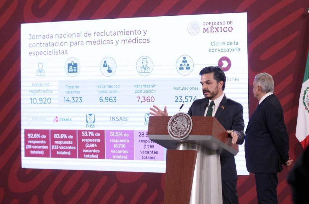Señaló que la convocatoria original pasó de 13 mil 765 a 14 mil 323 debido a que Insabi aumentó el número de plazas; de estas, 6 mil 963 tuvieron por lo menos una postulación de un médico, en tanto que 7 mil 360 no tienen ninguna.