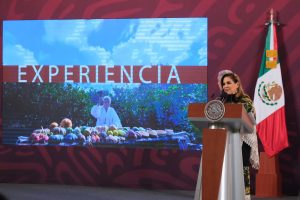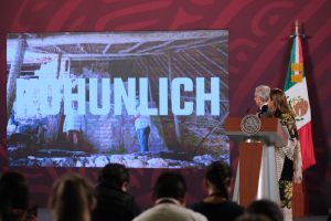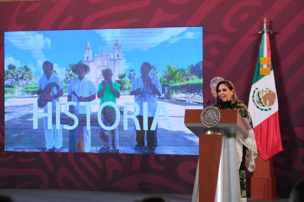 MÉXICO, 4 de diciembre. – “El Tren Maya, el tren de la justicia social con su gran conectividad a través de 12 estaciones estratégicas y ahora con 4 aeropuertos internacionales en Quintana Roo permitirá al mundo admirar los maravillosos vestigios arqueológicos de la cultura maya”, aseguró la gobernadora Mara Lezama Espinosa durante la conferencia matutina del presidente Andrés Manuel López Obrador en Palacio Nacional.