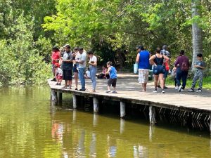 Como actividad lúdica los menores luego de escuchar una charla sobre los peces fueron testigos de cómo se hace la alimentación de peces en el lago mayor, así como las pláticas “Importancia ecológica del mapache”, en el recinto mapache; y “Conoce sobre flamencos”, en el recinto flamencos.