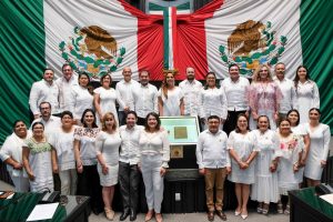 En el marco de la conmemoración del 49 aniversario de la promulgación de la Constitución del Estado Libre y Soberano de Quintana Roo, la gobernadora Mara Lezama, el diputado Luis Humberto Aldana Navarro, presidente de la Junta de Gobierno y Coordinación Política; el presidente de la Mesa Directivam diputado Issac Janix Alanis; el magistrado Heyden Cebada Rivas, presidente del Tribunal Superior de Justicia; acompañados por el diputado constituyente Gilberto Pastrana Novelo y el presidente del Gran Consejo Maya Simón Caamal Coh, montaron una guardia de honor a la Constitución como un reconocimiento a nuestra historia.