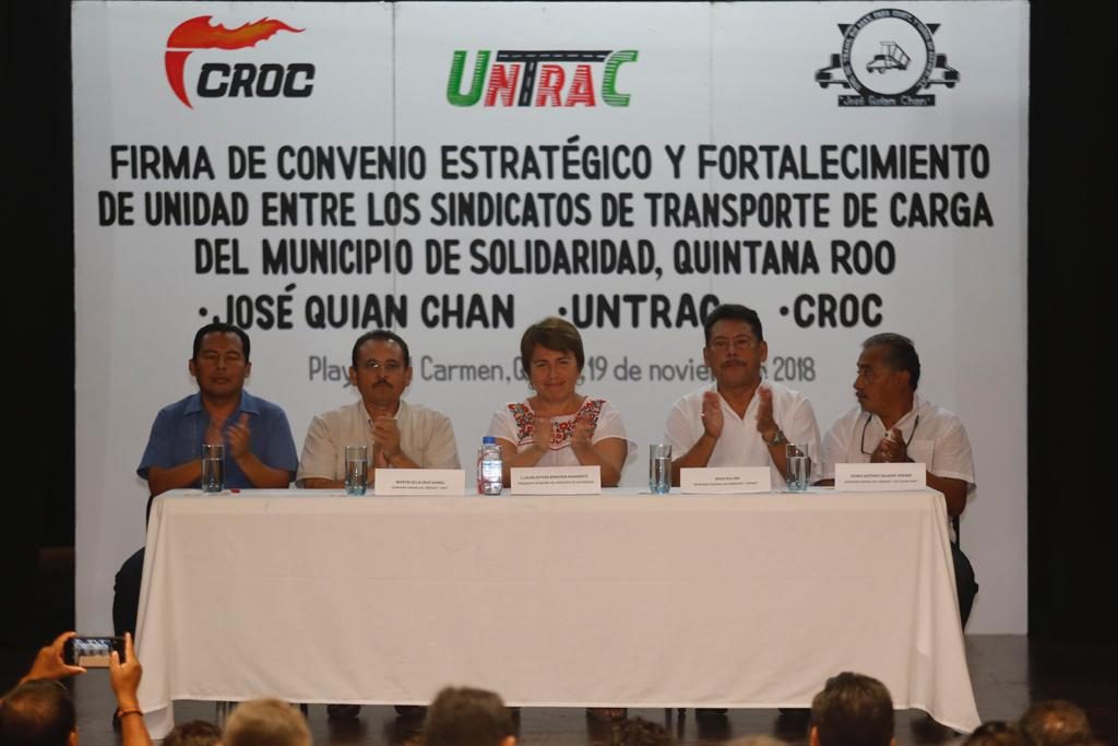 Solidaridad, Quintana Roo.- Más de 200 volqueteros de los sindicatos “José Quian Chan”, CROC y la Untrac reconocieron y agradecieron el liderazgo en Quintana Roo de la presidenta municipal, Laura Beristain Navarrete, a quien le dieron su absoluto respaldo para trabajar en unidad por el progreso y bienestar de Solidaridad, al participar en el convenio estratégico y fortalecimiento de la unidad laboral entre las tres organizaciones.