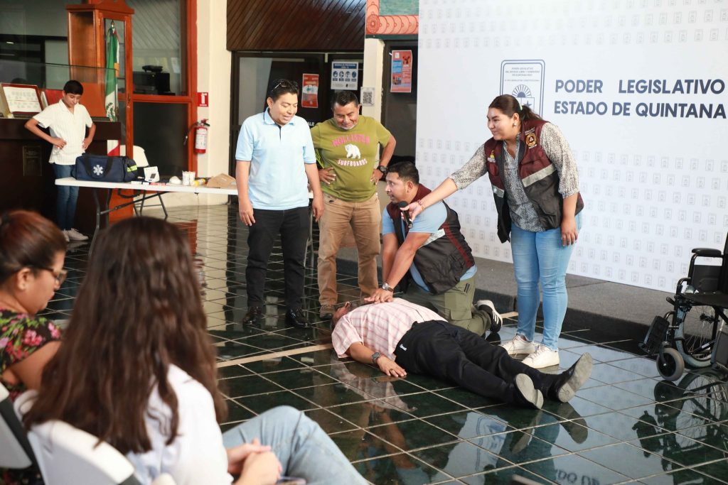 CHETUMAL, 15 de agosto. – Con el objetivo de implementar acciones de cuidado y salvaguarda del bienestar físico en caso de accidentes, así como llevar a cabo medidas precautorias y de rescate como primer respondiente, personal del Poder Legislativo participó en el taller de Primeros Auxilios, impartido por la Coordinación Estatal de Protección Civil.
