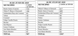 Como se puede ver en la tabla, Chetumal el 6 de junio del presente año tenía un total de 106 casos activos, ya para esos momentos estaba muy cerca de alcanzar a Cancún.