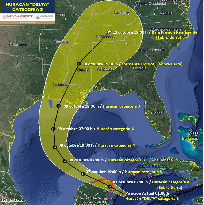 El centro del peligroso Huracán “Delta” ahora como categoría 3 en la escala Saffir-Simpson, muy cerca de las costas de Quintana Roo. Se localiza a 130 km al este-sureste de Cozumel, Q.Roo. Produce lluvias intensas a torrenciales en la Península de Yucatán y originará vientos fuertes con rachas de 150 a 240 km/h, oleaje de 6 a 10 metros de altura y una marea de tormenta de 1 a 2 metros de altura en el norte de Quintana Roo y de 2 a 4 metros en las costas de Yucatán.