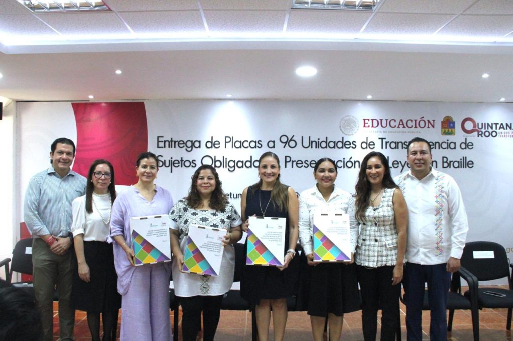 CHETUMAL, 2 de diciembre. – En un esfuerzo por reducir las brechas de desigualdad y fomentar la inclusión, el Instituto de Acceso a la Información y Protección de Datos Personales de Quintana Roo (Idaipqroo) entregó a las Unidades de Transparencia de los Sujetos Obligados del Estado, 96 placas en formato Braille con las cuales se podrán identificar las oficinas mediante lectura táctil, brindando así un mejor servicio para las personas con discapacidad visual a los espacios físicos.