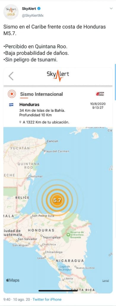 “El sismo de 5.7 grados en escala de Richter se registró este lunes a las 9:13 horas frente las costas de Honduras, el cual pudo ser percibido en todo Quintana Roo, según los reportes que se emitieron al número de emergencias 9-1-1. Las vibraciones solo ocasionaron susto a la población, ya que no se tuvo reporte de daños” dijo Martínez Ortega.