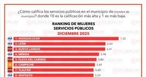 En el rubro de servicios públicos, Playa del Carmen alcanza 5.80, posicionándose en el 5.º lugar nacional, consolidándose como el Municipio mejor evaluado de Quintana Roo en este indicador.