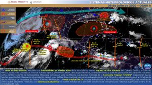 Este día, un canal de baja presión sobre el interior del territorio nacional, asociado con inestabilidad en niveles altos de la atmósfera y con el ingreso de aire húmedo del Océano Pacífico y Golfo de México, ocasionará chubascos y lluvias fuertes a puntuales muy fuertes, descargas eléctricas, rachas de viento y posibles granizadas en zonas del noroeste, norte, centro y oriente de la República Mexicana, incluido el Valle de México.
