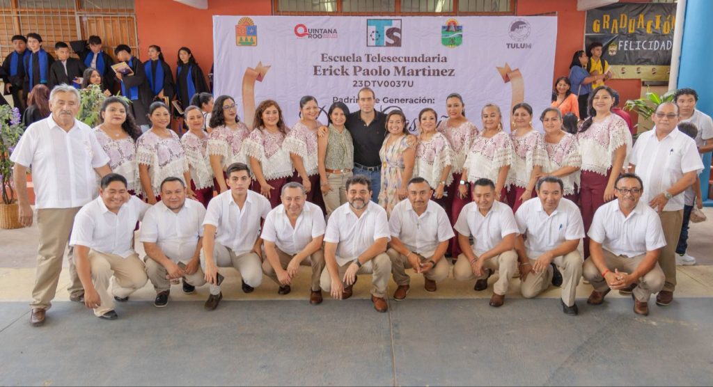 TULUM, 12 de julio del 2023.- El Presidente Municipal de Tulum, Diego Castañón Trejo fue el padrino de la graduación de 179 jóvenes estudiantes de la generación 2020-2023 de la Escuela Telesecundaria “Erick Paolo Martínez”. “Hoy cumplen una meta más en la vida. Que nada, ni nadie les detenga, sean jóvenes de bien, y cumplan sus sueños, afirmó al dirigirse a los recién egresados.