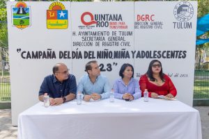 TULUM, 29 de abril.- El presidente municipal Diego Castañón Trejo, la síndico María Teresa Arana Sánchez, el secretario general del Ayuntamiento, Jorge Alberto Portilla Mánica y la directora del Registro Civil, Clarisa Yasmin Pat Maza, encabezaron la entrega de 41 actas de nacimiento extemporáneas gratuitas, como parte de la campaña del Día del Niño, Niña y Adolescentes 2023.
