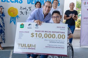 TULUM, 18 de mayo.- Emiliano Escalante Pérez, de la academia de Judo, fue el primer atleta en recibir de manos del Presidente Municipal Diego Castañón Trejo una Beca Deportiva Municipal de diez mil pesos, la cual es otorgada por el Ayuntamiento de Tulum con el propósito de fortalecer la preparación física y deportiva de grandes atletas tulumnenses.