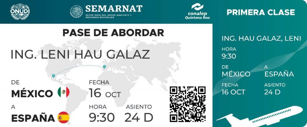 CHETUMAL, 16 de octubre.- Leni de los Ángeles Hau Galaz, docente del Colegio Nacional de Educación Profesional Técnica (Conalep) Quintana Roo recibió de manera simbólica el boleto de avión y vestimenta del plantel Playa del Carmen para viajar a Madrid, España donde continuará con su formación como instructora especializada en la reducción de emisiones dañinas de los sistemas de refrigeración y aires acondicionados.