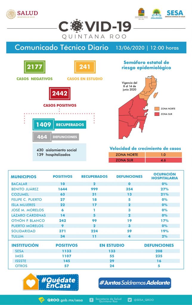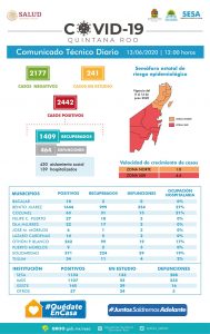 Chetumal, Q.R. – La capital de Quintana Roo tiene otra jornada de crecimiento acelerado en los contagios de Covid-19, subió a 242 casos. Las cifras estatales también suben, se coloca en 464 defunciones y 2 mil 442 casos positivos. Permanecen activos 569 personas con el virus.