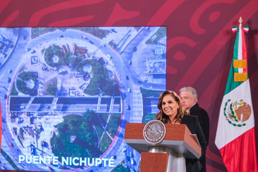 La gobernadora Mara Lezama agradeció al presidente López Obrador por las obras que se ejecutan en Cancún y que serán detonantes para el crecimiento económico: el bulevar Colosio, el distribuidor vial al aeropuerto internacional, el puente vehicular Nichupté y la ampliación de la avenida Chac Mool.