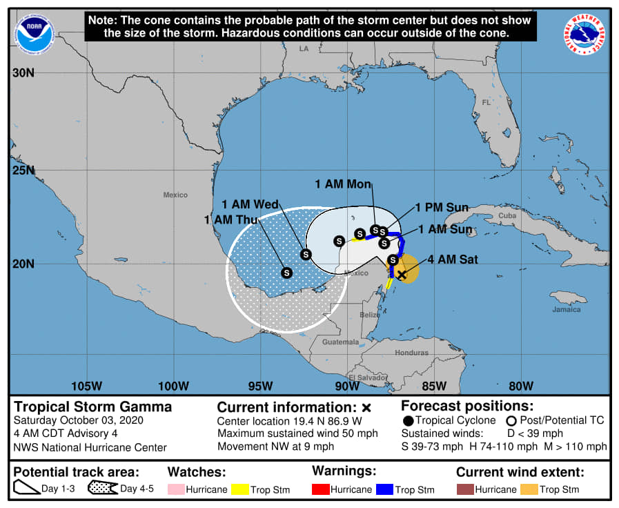 A las 6:00 horas el centro de la tormenta tropical “Gamma” se ubicaba aproximadamente 30 kilómetros al este de Punta Herrero y a 90 kilómetros al sur de Cozumel. Presenta vientos máximos sostenidos de 85 km/h, rachas de 110 km/h y desplazamiento hacia el noreste de 15 km/h.