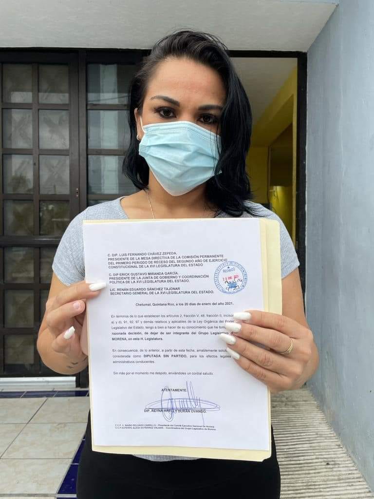 Chetumal, Q.R.- En rechazo a los agravios a los estatutos de Morena, la diputada Reyna Durán Ovando, renunció a la Fracción Parlamentaria en la XVI Legislatura. Se declaró independiente, pero advirtió continuará apoyando la labor del Presidente de México, Andrés Manuel López Obrador.