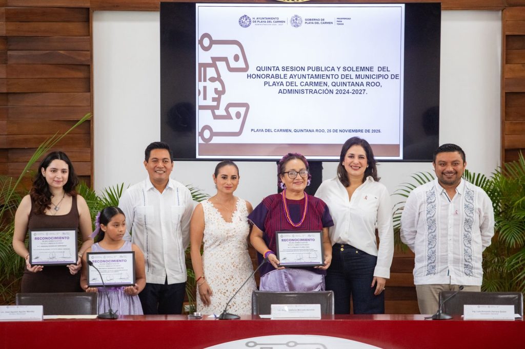 PLAYA DEL CARMEN, 25 de noviembre. – En el marco del “Día Internacional para la Eliminación de la Violencia contra las Mujeres”, la presidenta municipal Estefanía Mercado encabezó la Quinta Sesión Solemne de Cabildo, con motivo de la Entrega del Premio a la Mujer Sobresaliente “Elvia Carrillo Puerto” 2025, un reconocimiento a la trayectoria y aportaciones de mujeres playenses en distintos ámbitos sociales, culturales y comunitarios.