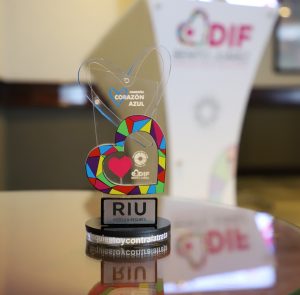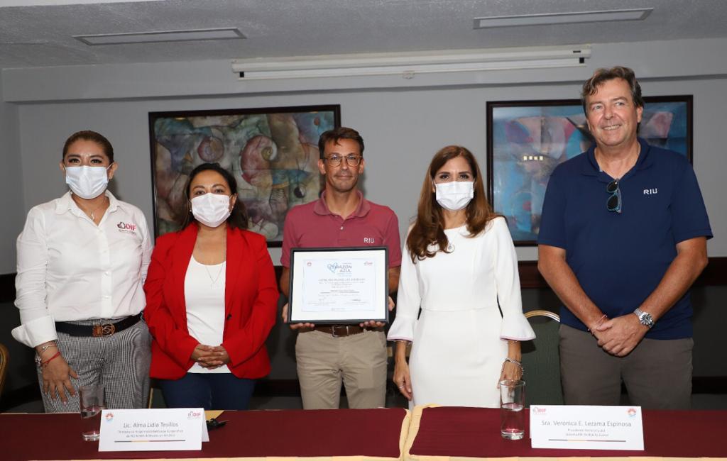 BENITO JUÁREZ, 15 de julio.- Con el objetivo de fortalecer las acciones para proteger del delito de trata a los niños benitojuarenses, la presidenta honoraria del Sistema DIF Municipal, Verónica Lezama Espinosa encabezó la entrega del distintivo “Corazón Azul” al Corporativo Hoteles RIU and Resort.