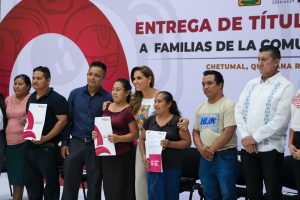 CHETUMAL, 4 de julio.- La gobernadora Mara Lezama Espinosa entregó hoy los primeros títulos de propiedad a habitantes de Maya Balam, municipio de Bacalar, que tuvieron que esperar más de 30 años para recibir atención jurídica sobre sus lotes y parcelas.