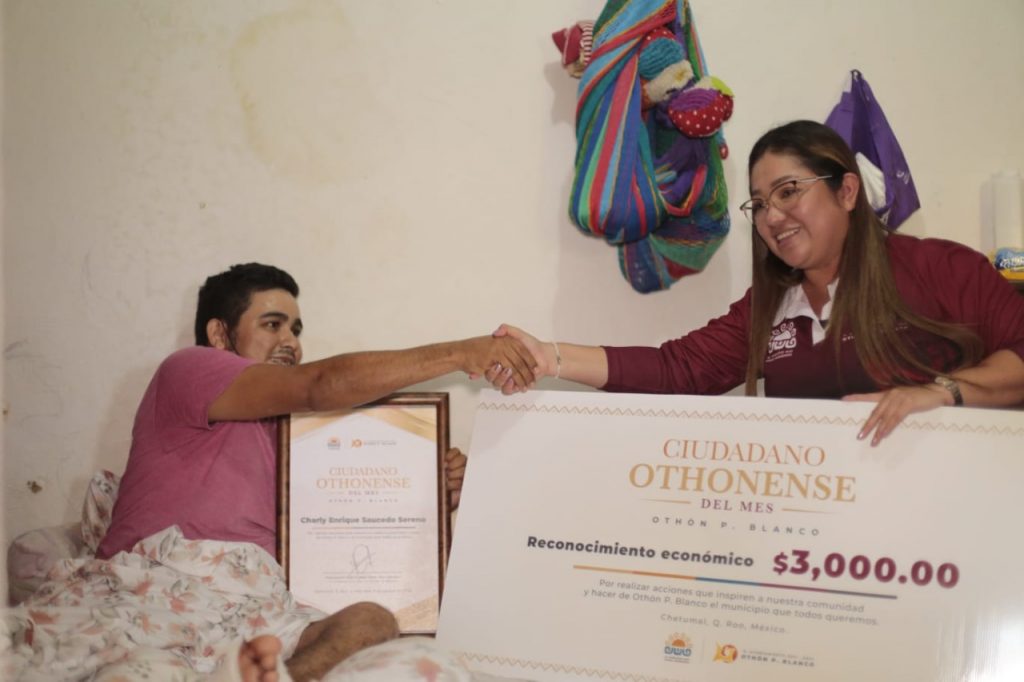 CHETUMAL, 3 de agosto.- “Ahora nos toca a nosotros regresarle un poco de lo mucho que él hace, tuvo un accidente, ahora queremos darte algo, es poco, pero es de todo corazón, es muy significativo. Gracias por todo lo que has hecho, nunca alcanza para apoyar a todas y todos completamente y personas como tú, nos ayudan a cubrir esos sectores que nosotros no podemos alcanzar”, expuso la presidenta municipal de Othón P. Blanco, Yensunni Martínez Hernández, en el marco de la entrega del reconocimiento al “Ciudadano othonense del mes”.