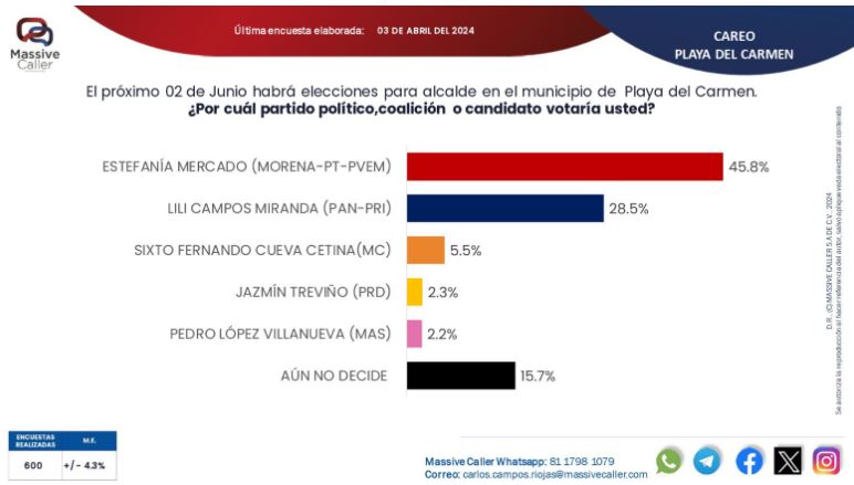 PLAYA DEL CARMEN, 4 de abril. – La diputada con licencia Estefanía Mercado incrementa su ventaja sobre la panista Lili Campos, en el camino a la presidencia municipal de Solidaridad, según encuesta publicada este jueves por Massive Caller.