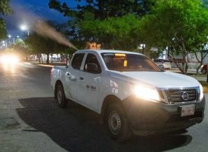 “Estamos reforzando las jornadas de fumigación en colonias, y pedimos a la ciudadanía que cuando vean pasar las unidades abran puertas y ventanas, para que el químico llegue a proteger sus hogares”, señaló durante el recorrido.