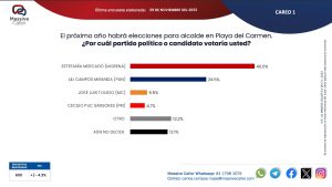 Con estos resultados, Massive Caller coloca a Estefanía Mercado en el primer lugar en la intención del voto para el municipio de Solidaridad, quien, por más de tres meses, ha tenido un crecimiento sostenido, en tanto la marca MORENA se reafirma igualmente en las preferencias de la población playense con 45.7 % muy por encima de los 23 puntos del PAN.