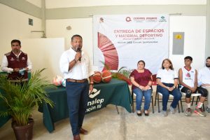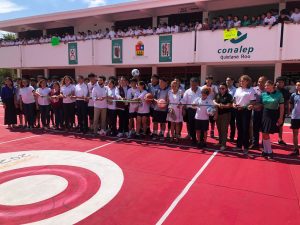 BENITO JUÁREZ, 20 de abril.- Con la suma de esfuerzos entre instituciones educativas y deportivas para fortalecer el deporte entre los estudiantes, se entregó material deportivo y mejoramiento de espacios del plantel Conalep 3 de Cancún, en beneficio de más de mil alumnos.