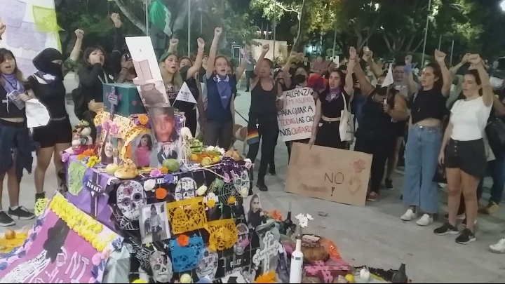 Continuaron hasta el palacio municipal al llegar les esperaba un altar que otros integrantes colocaron para recordar a Bianca Alejandrina conocida como Alexis y a otras víctimas de feminicidio.